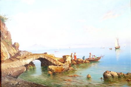FRANCESCO CAPUANO, Francesco Capuano (1854/1908) olio su tela raff. "Veduta marina con figure e Vesuvio" - cm 52.2 x 34.5