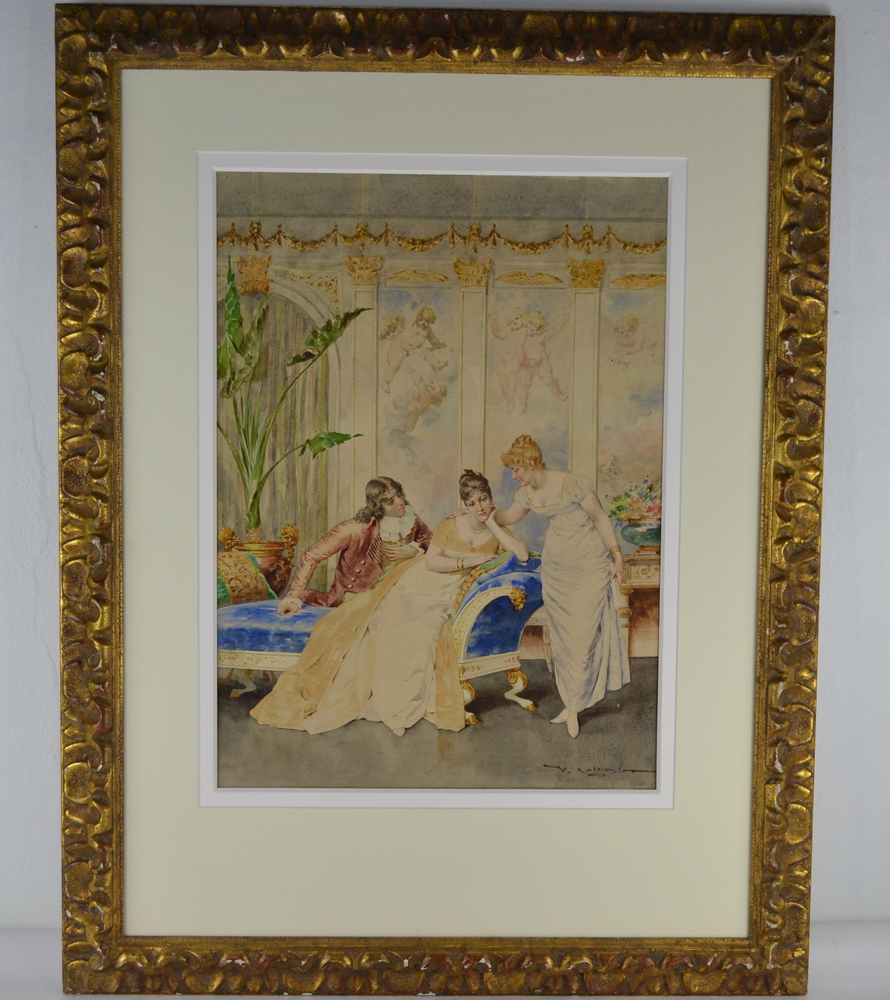 DIPINTO, Scuola francese del XIX sec. acquerello su carta raff. "Scena in interno" - cm 53 x 38 - firmato in basso a dx