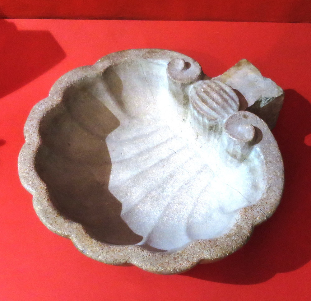 ACQUASANTIERA, Acquasantiera in pietra rossa sagomata a motivo di conchiglia...