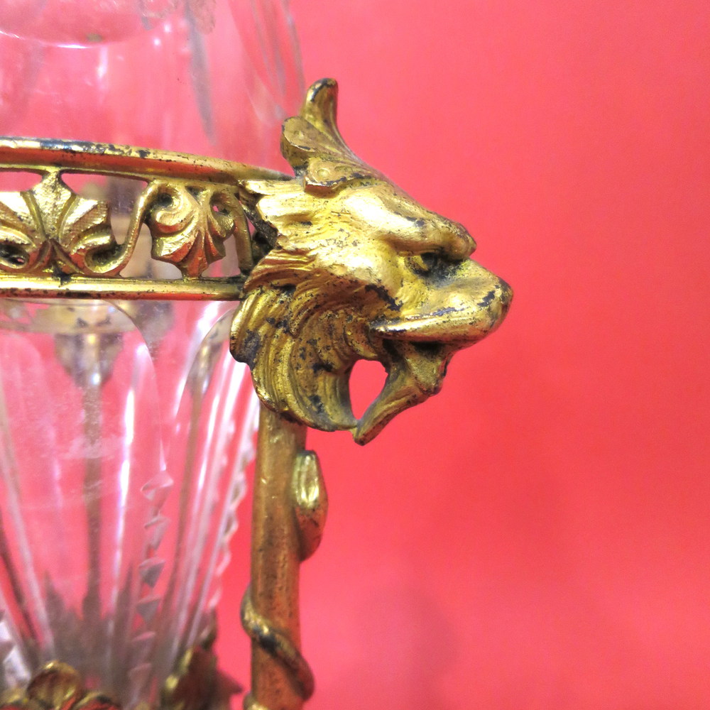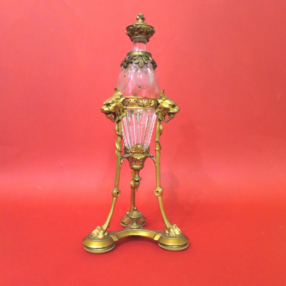 BOTTIGLIA, Bottiglia in cristallo sostenuta da tripode in bronzo dorato - h 32 cm - Francia Napoleone III