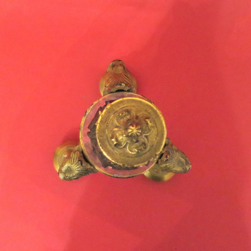 BOTTIGLIA, Bottiglia in cristallo sostenuta da tripode in bronzo dorato - h...