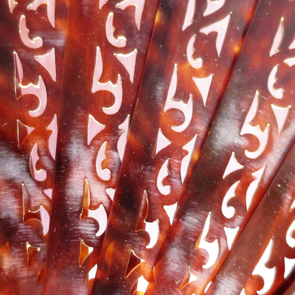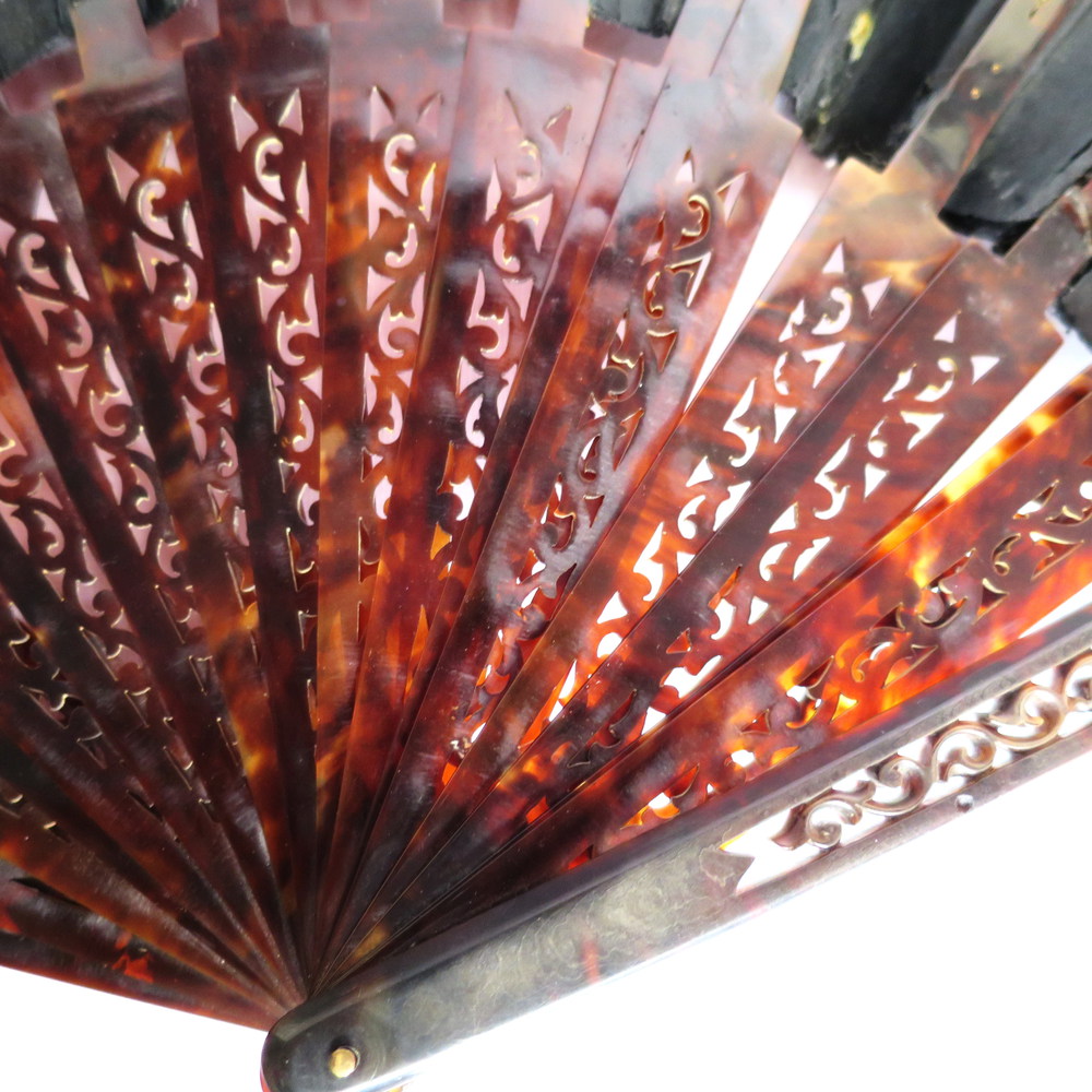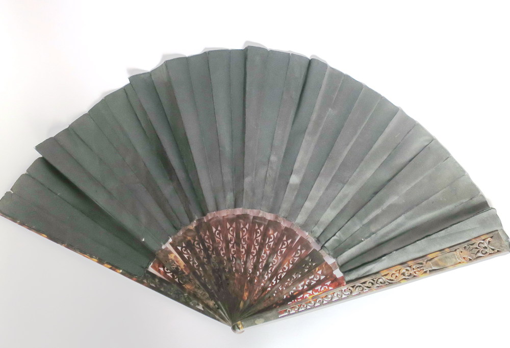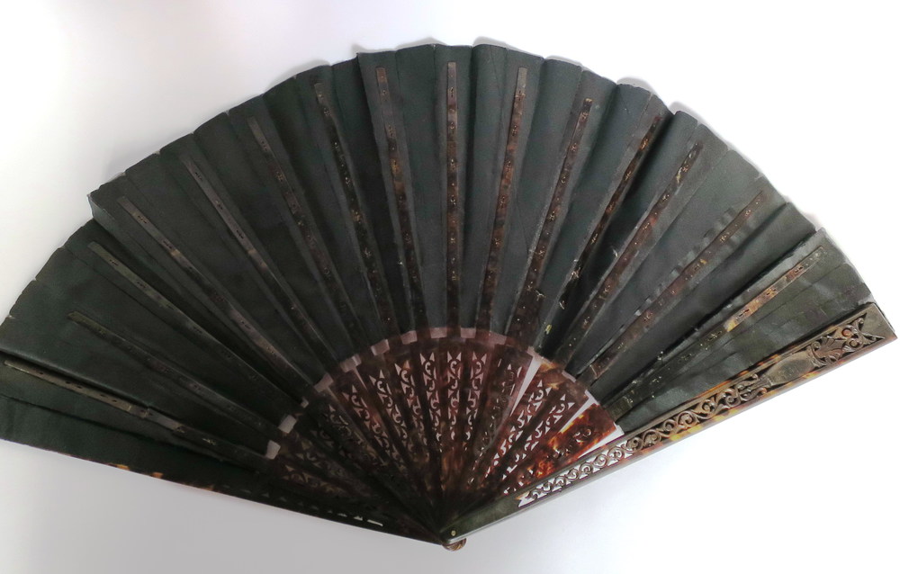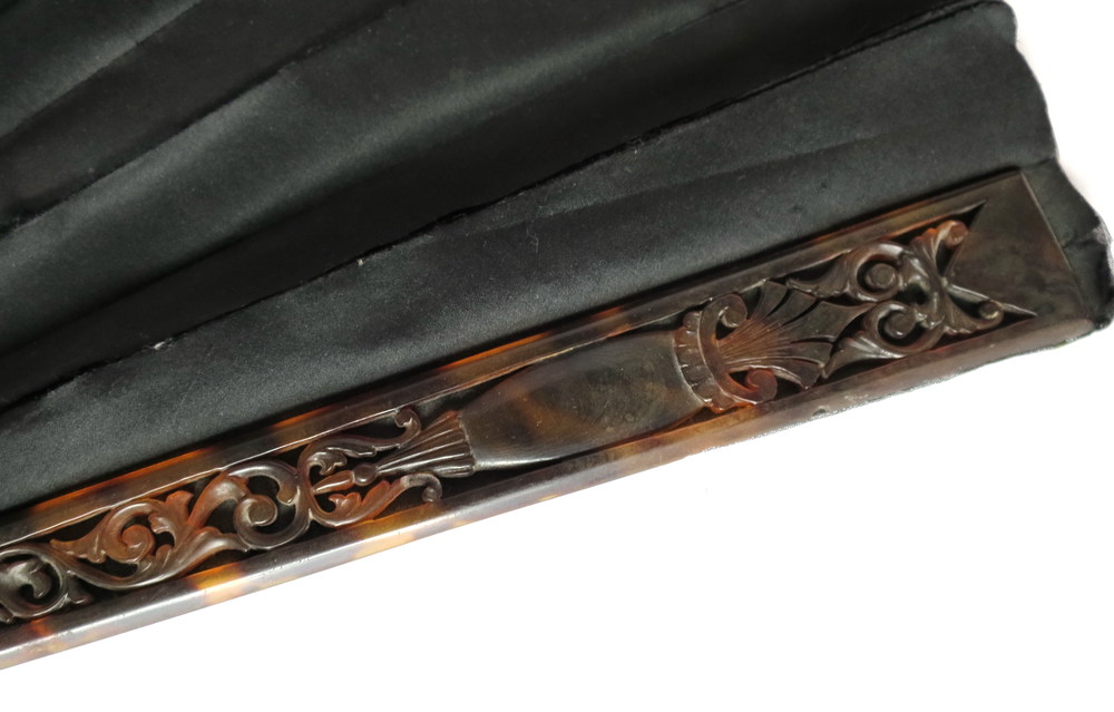 VENTAGLIO, Ventaglio in seta nera con impugnatura in tartaruga bionda con decoro a traforo - XIX sec.