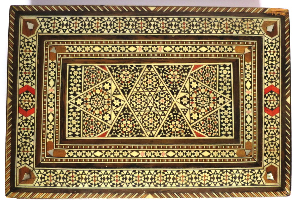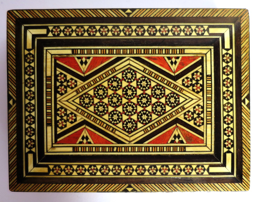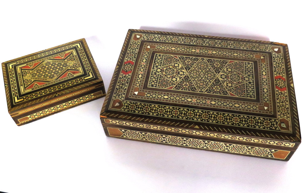 SCATOLE, Due scatole intarsiate a decori geometrici con presenza a tutto campo di tessere in avorio - cm 29.6 x 21.3 - cm 16.5 x 12.5 - Oriente 1940 ca