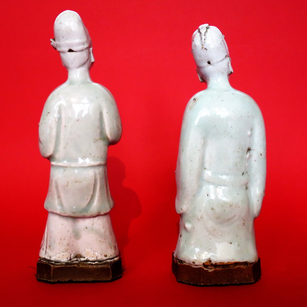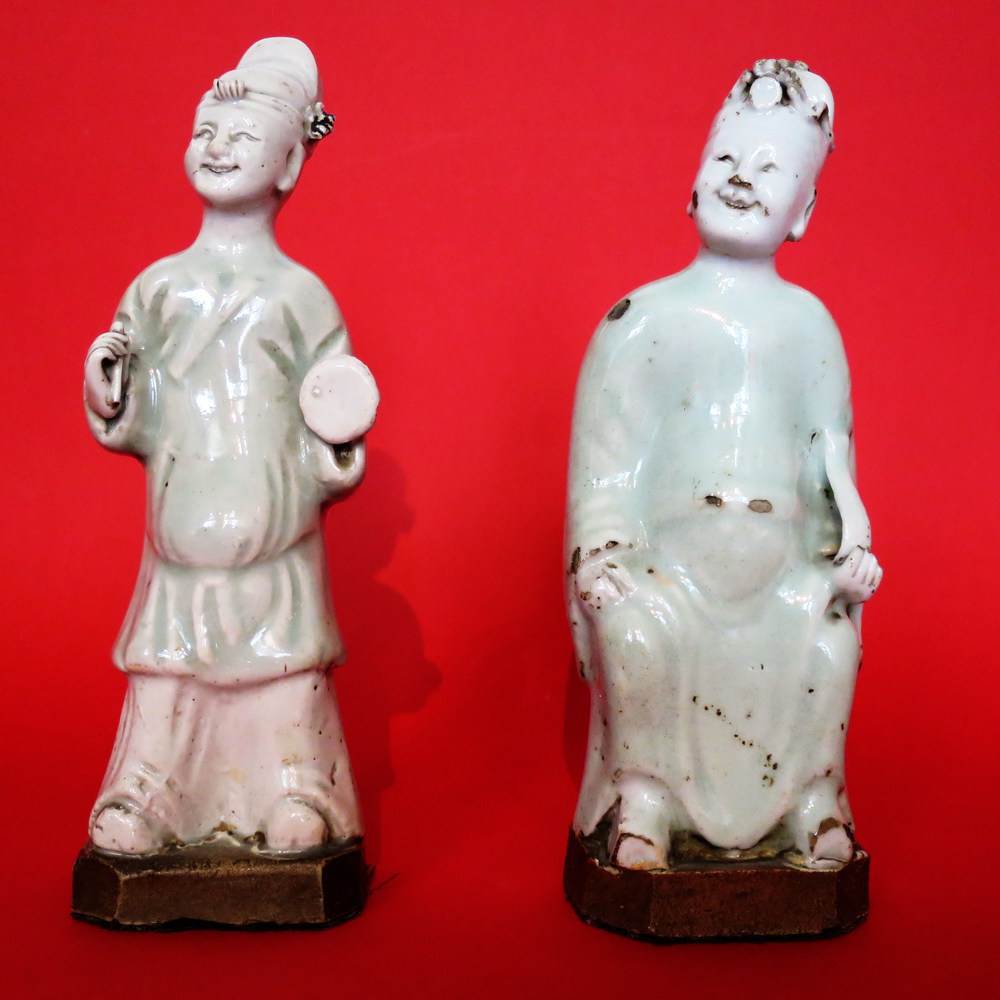 CINA, Due statuette in porcellana bianca raff. "Personaggi ridenti" - Cina XVVIII sec. - Difetti