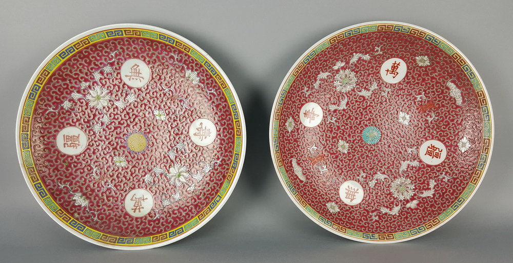 CINA, Due piatti in porcellana policroma finemente decorati - diam. 33 cm - Cina XIX/XX sec.
