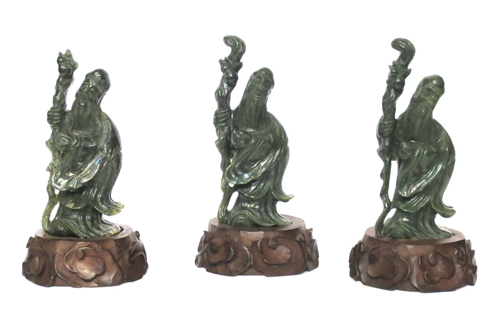 Lot 334 | GIADAITE, Tre sculture in giadaite raff. "Santoni" - h 16.5 cm - Cina XX sec.