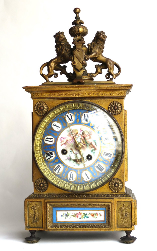 OROLOGIO, da tavola in bronzo dorato. placche in porcellana dipinte. H: cm 44...