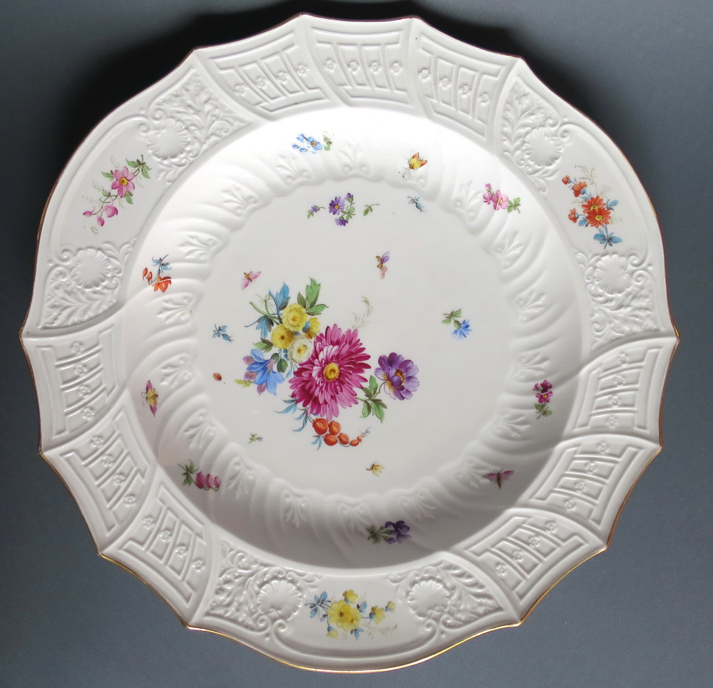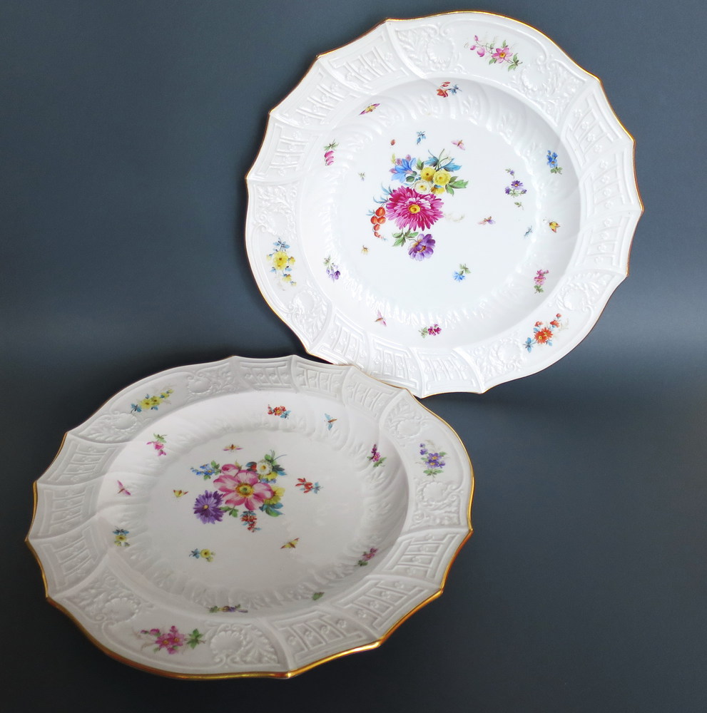 PIATTI, Coppia di piatti in porcellana con decori floreali e doratura sul profilo polilobato - diam. 32.5 cm