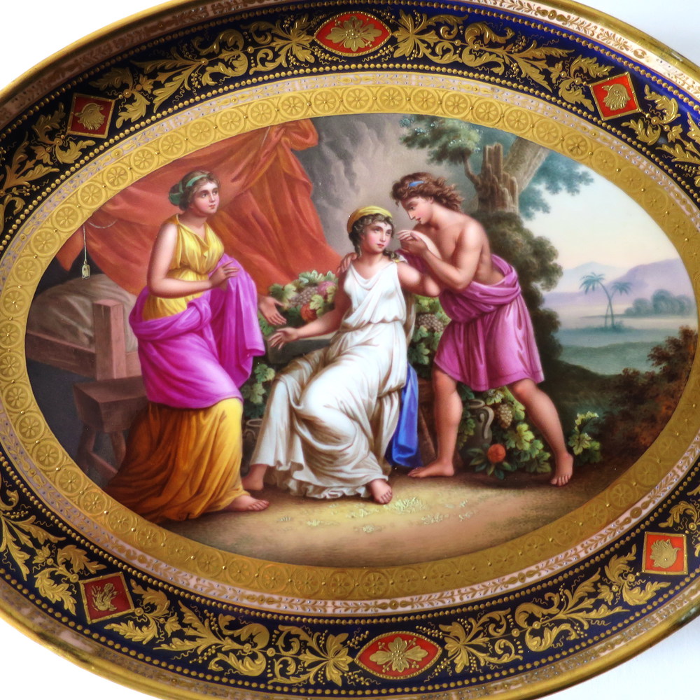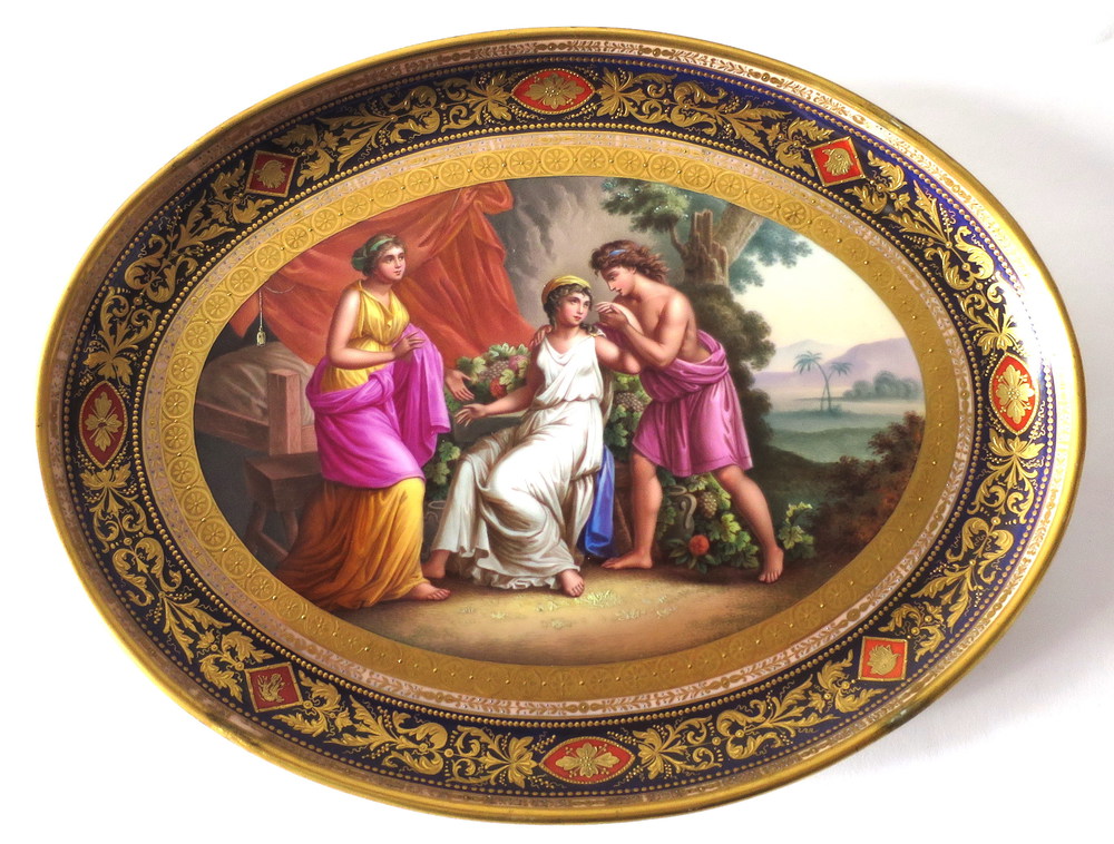 PIATTO, Piatto porcellana dipinto raff. "figure in convivio" lumeggiatura in oro zecchino Vienna XIX sec.- cm 27.5 x 21