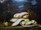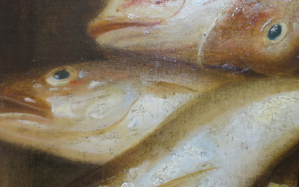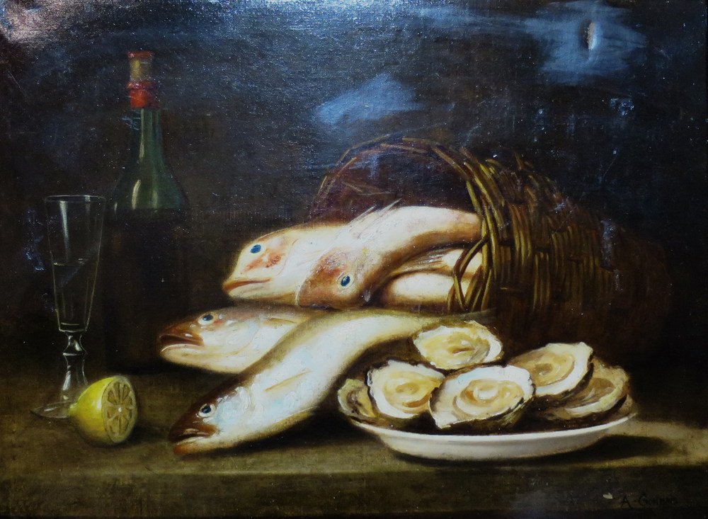 DIPINTO, Dipinto olio su tela raff. "Natura morta di pesci in cesta" - cm 49...