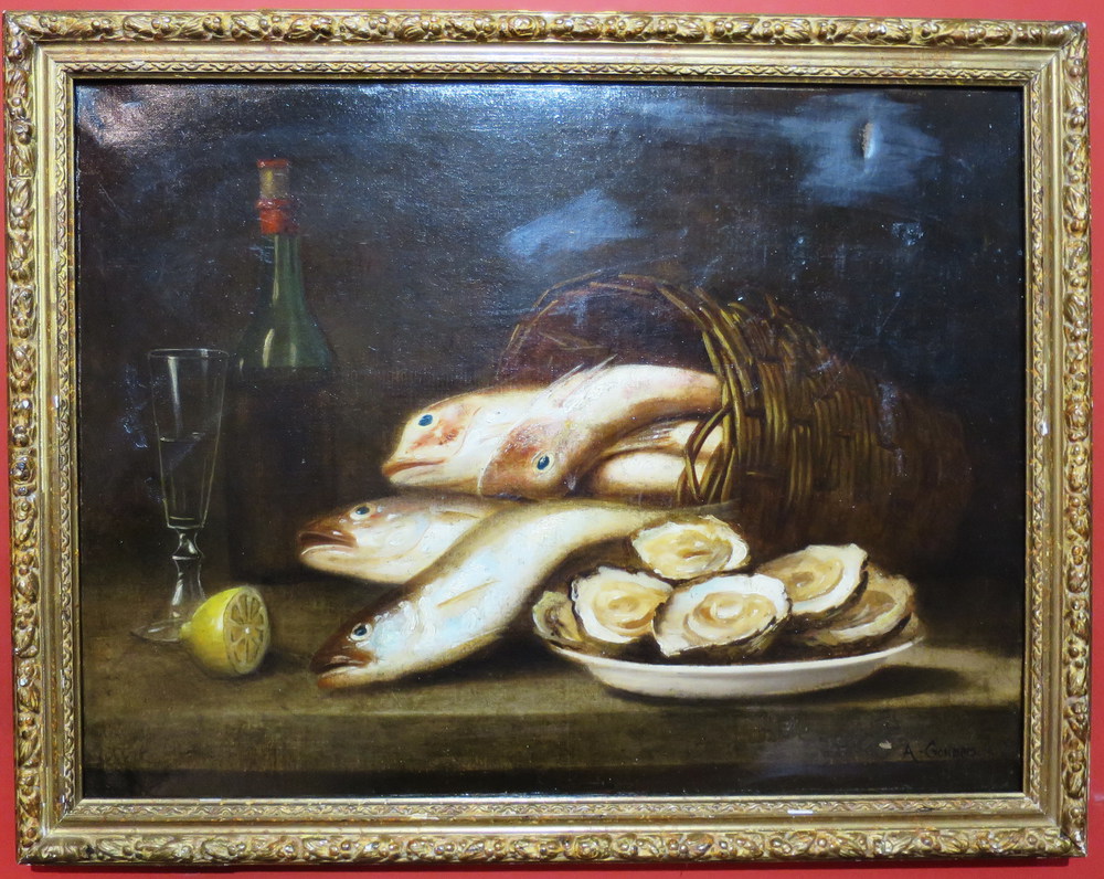 DIPINTO, Dipinto olio su tela raff. "Natura morta di pesci in cesta" - cm 49 x 65 - firmato in basso a dx - XIX sec.