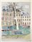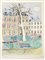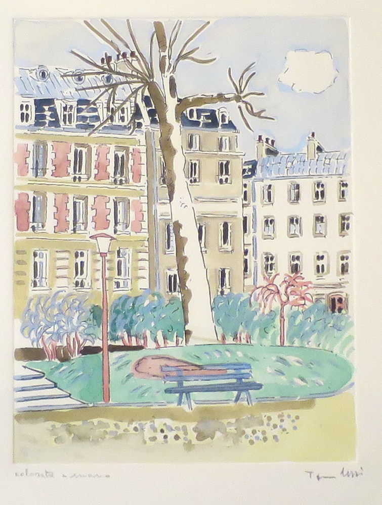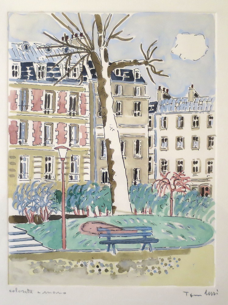 ORFEO TAMBURI, Orfeo Tamburi stampa acquerellata colorata a mano raff. "albero ed edifici" - cm 44 X 59