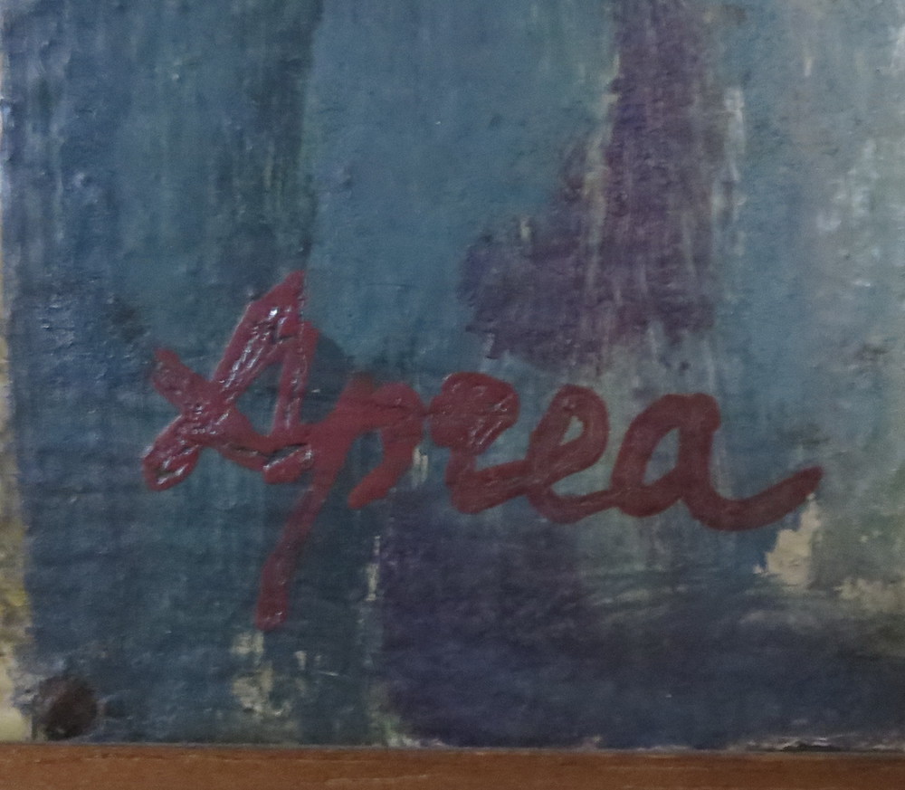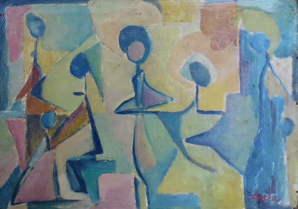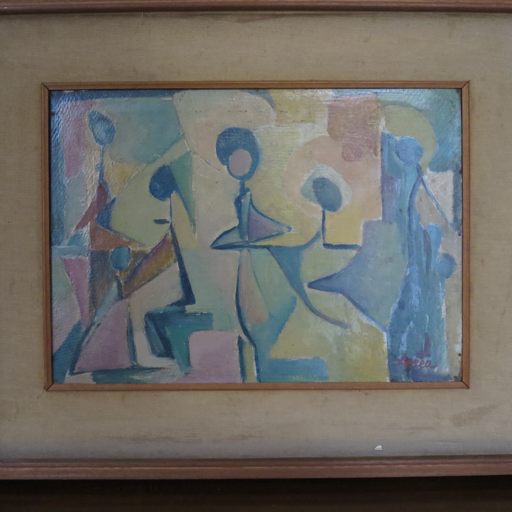 DIPINTO, Aprea olio su tavola raff. "Figure stilizzate" - cm 25 x 35 - firmato in basso a dx