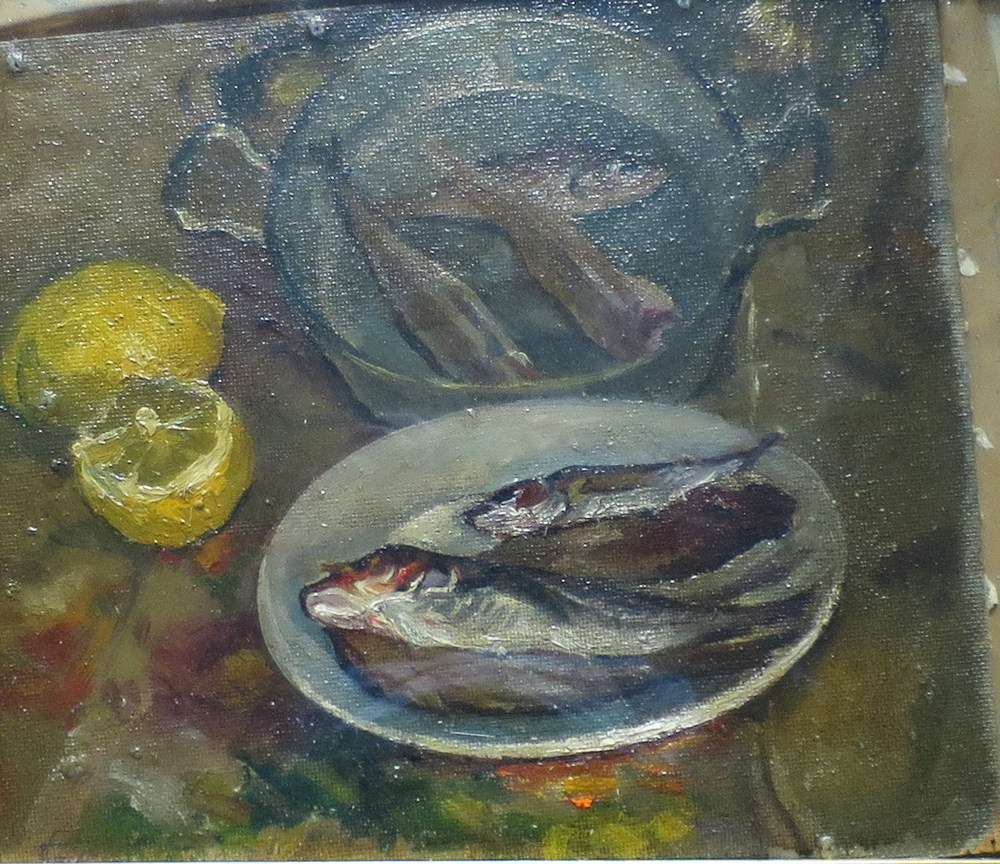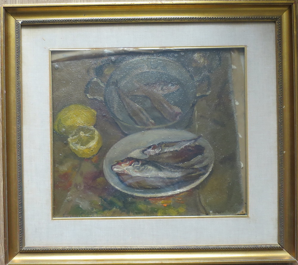 DIPINTO, Dipinto olio su cartone telato raff. "Natura morta di pesci" - cm 40...