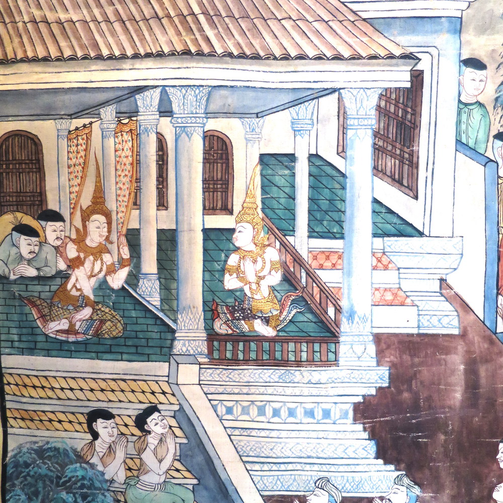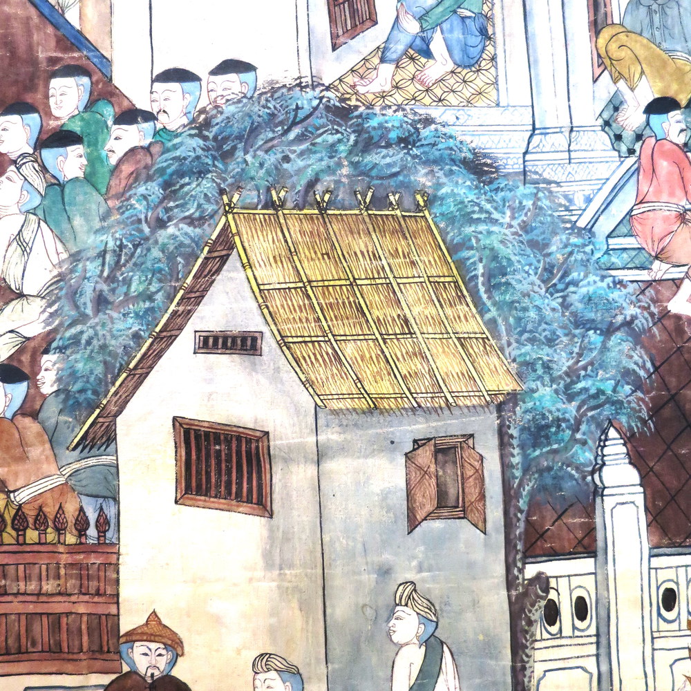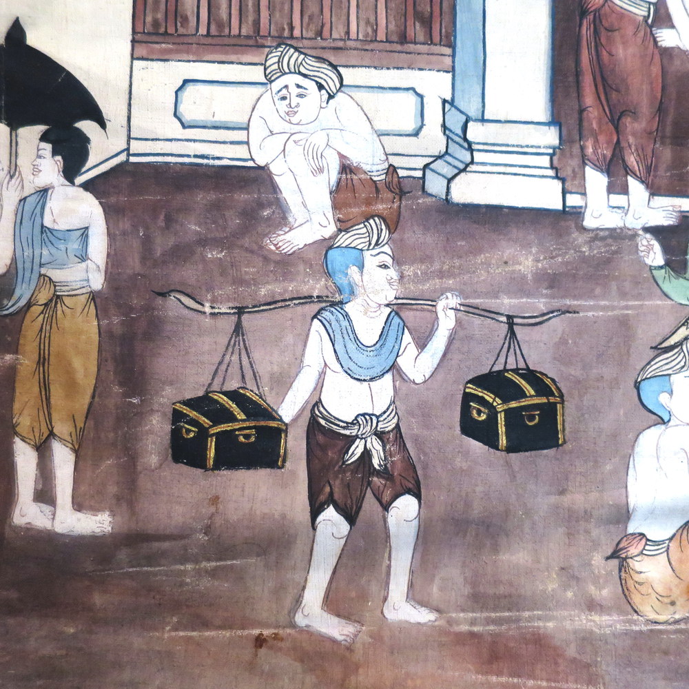 PANNELLO, Pannello in cotone dipinto raff. "scene di vita quotidiana" - Thailandia 1920 - cm 87.5 x 154