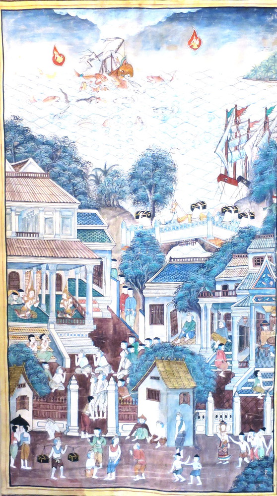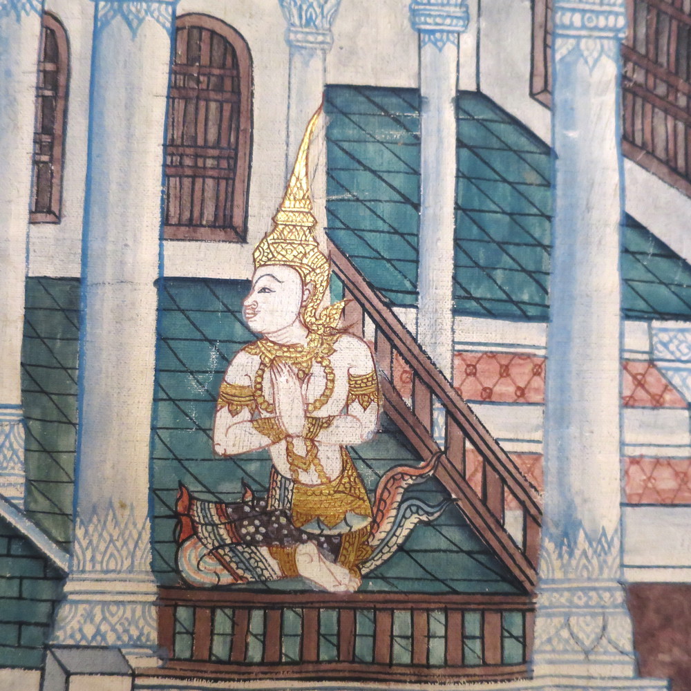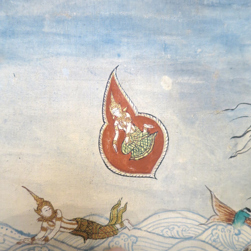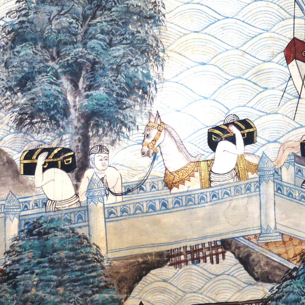 PANNELLO, Pannello in cotone dipinto raff. "scene di vita quotidiana" - Thailandia 1920 - cm 87.5 x 154