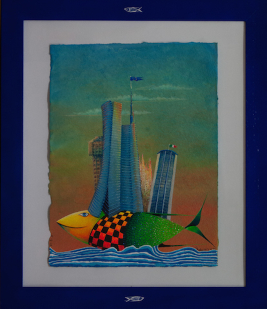 MELONISKI, Meloniski da Villacidro "Pesce sognatore" tecnica mista su carta con cornice realizzata dall'artista - cm 60 x 70
