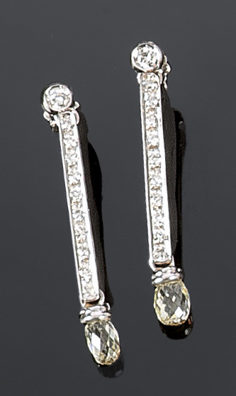 COPPIA DI ORECCHINI Coppia di orecchini pendenti in oro bianco con barretta rigida con venti diamanti taglio brillante rotondo 8/8, per complessivi ct 0,50, terminanti con due gocce di diamanti taglio briolette Peso gr. 5,1 Certificato di analisi R.A.G. n. VA005/11mm rilasciato in data 19/01/2011