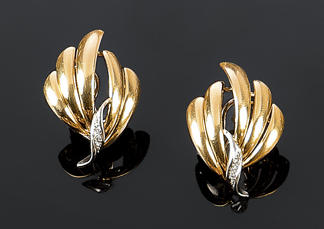 COPPIA DI ORECCHINI Coppia di orecchini in oro giallo e bianco a forma di foglia, con diamanti taglio brillante rotondo taglio 8/8 Peso gr. 9,8