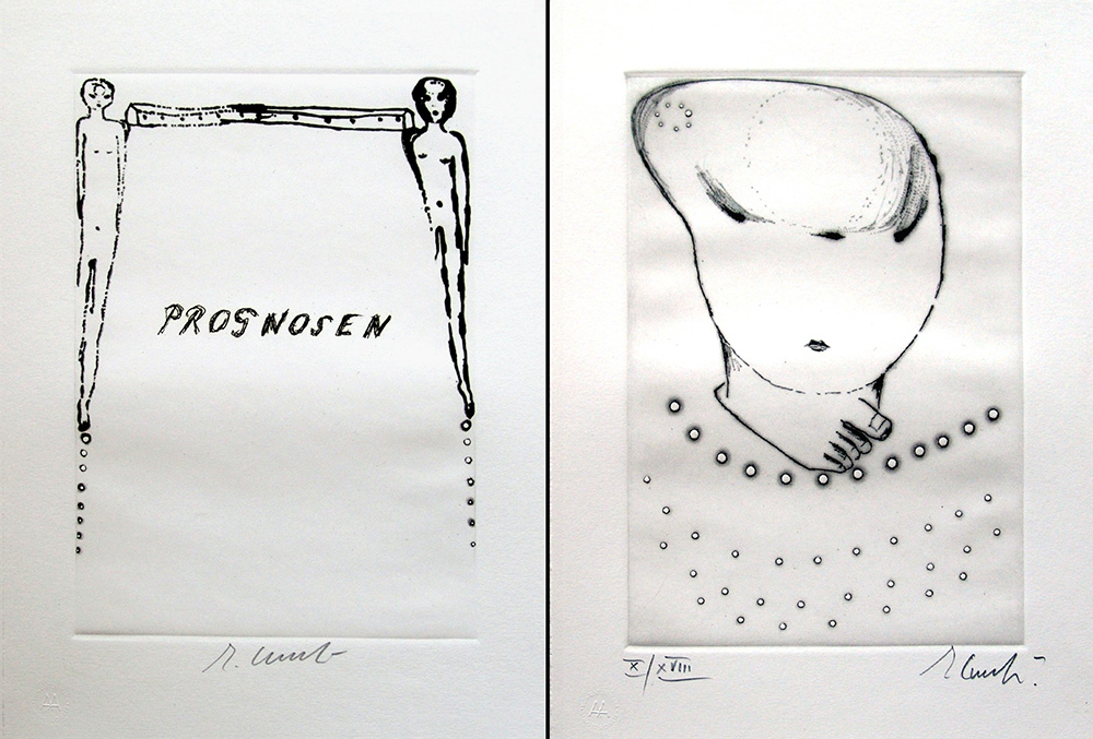 Enzo Cucchi 1949, Morro d'Alba (An) - [Italia] Prognosen acquaforte 35x26 cm cad. 1993 es. X/XVII; 2 acqueforti con firma dell'artista e timbro Stamperia d'Arte Vigna Antoniniana in basso, incorniciate insieme; con libro di Ernst Jünger certificato di autenticità Picenum