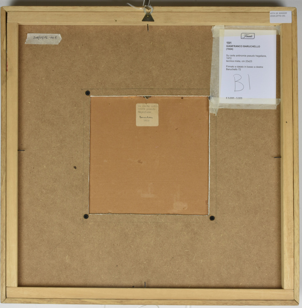 Gianfranco Baruchello SU CERTE ANTINOMIE PSEUDO HEGELIANE tecnica mista, cm 23x23 firmato e datato sul retro: firmato e titolato eseguito nel 1972 Provenienza: Collezione privata