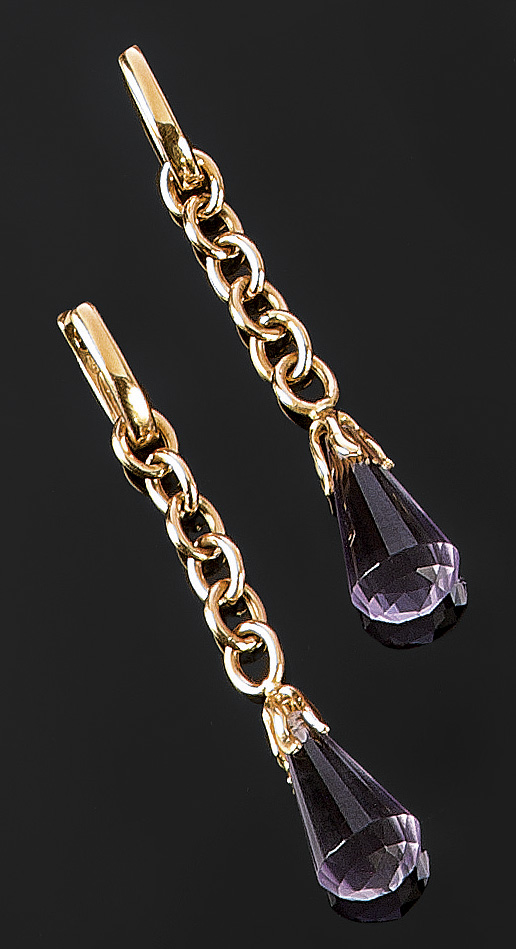COPPIA DI ORECCHINI Coppia di orecchini in oro giallo con corpo in maglia e due gocce di ametista sfaccettete pendenti Peso gr. 10,8