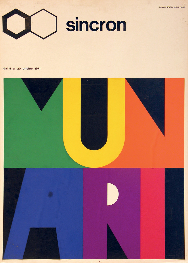 Bruno Munari BOZZETTO SINCRON Collage, lettering trasferibile e china su cartone Shoeller, cm 103x73 eseguito nel 1971 Il logo a colori, collage di retini colorati e` di Bruno Munari, l’impianto grafico del manifesto (lettering e logo della galleria Sincron di Brescia) e` di Piero Risari. Il logo realizzato da Bruno Munari per la realizzazione dei manifesti di numerose sue mostre trova riferimenti sul volume di Roberto Zeni, Bruno Munari, Appunti 1926-1998