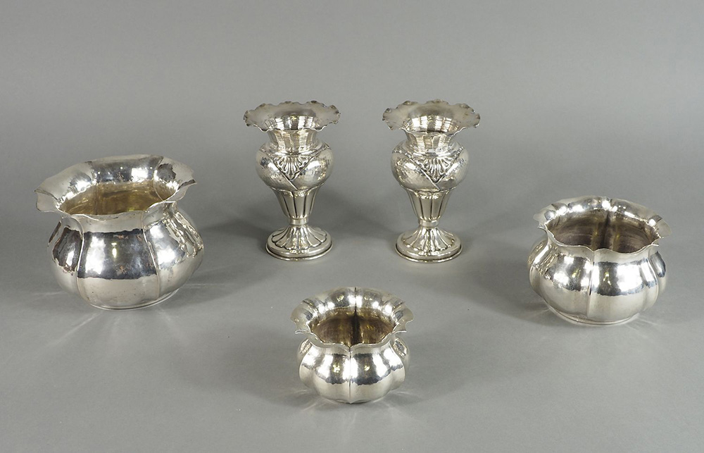 Lotto in argento composto da 3 ciotole e coppia di vasetti. Gr. 990.