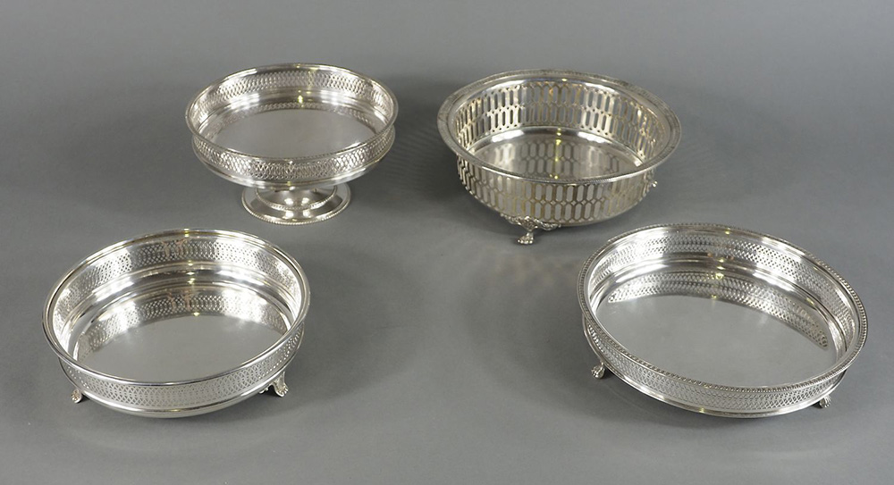 Lotto in argento composto da 4 pezzi tra cui centrotavola rotondo. Gr. 980.
