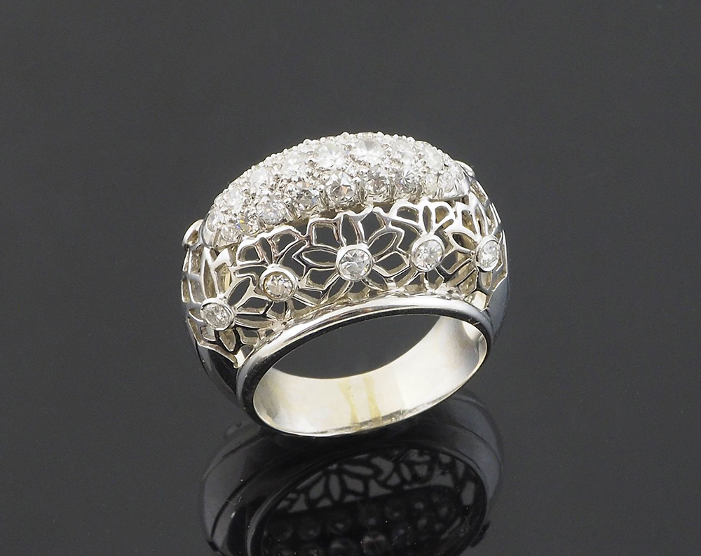 Anello cupola in oro bianco con lavorazione a traforo, parte centrale pavè di diamanti taglio brillante