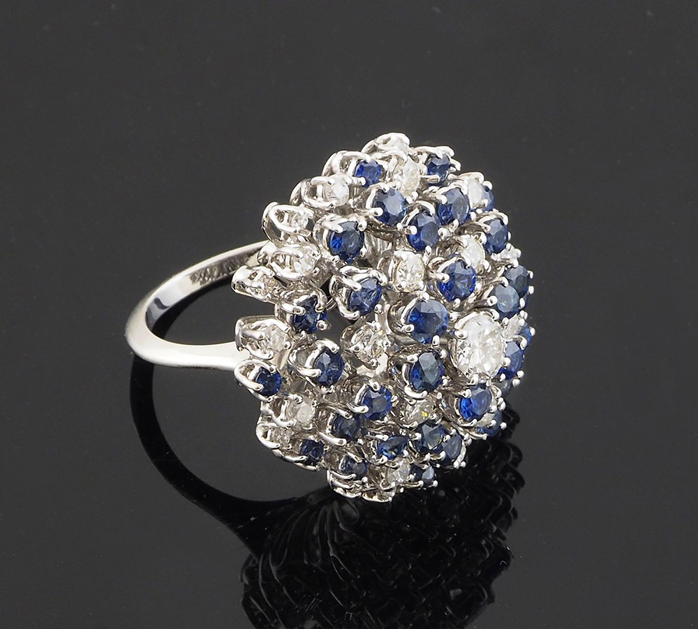 Anello a cupola in oro bianco con diamanti taglio brillante e zaffiri