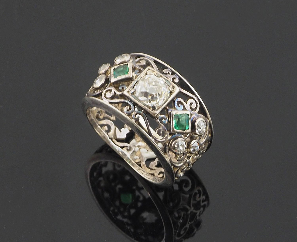 Anello in oro bianco lavorazione manuale a traforo con diamante centrale taglio vecchio per 0,75ct circa (colore IS, purezza VS) e altri diamanti di taglio vecchio