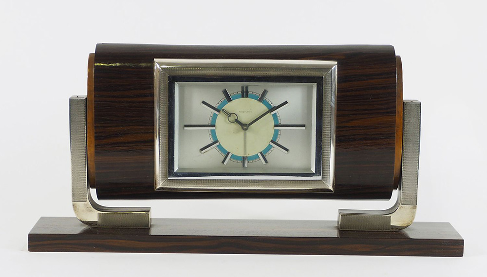 MonetWatch: orologio da tavolo in legno e argento. Art-Decò. Lung. cm. 44.