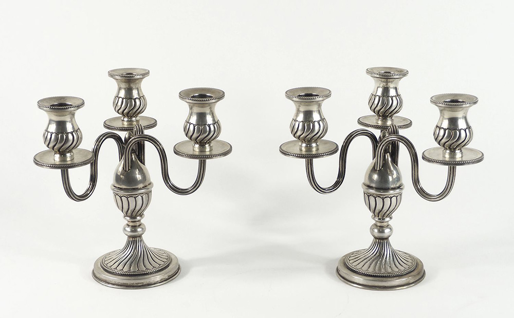 Paio di candelieri a 3 fiamme in argento lavorati a coste verticali. H. cm. 19. Gr. 920.