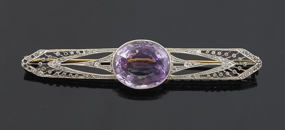 Spilla a barretta in argento con al centro ametista ovale, primi '900 (lievi mancanze)