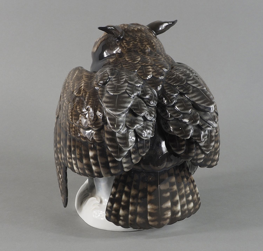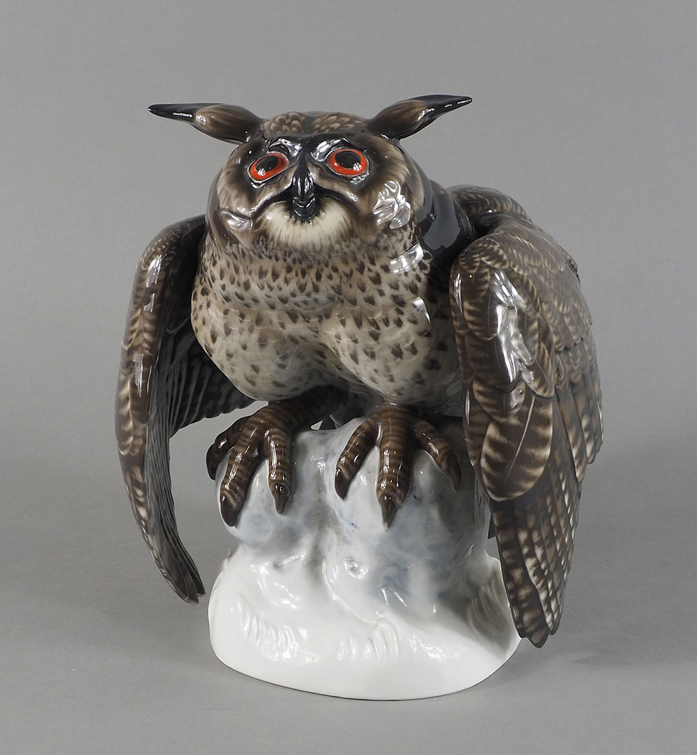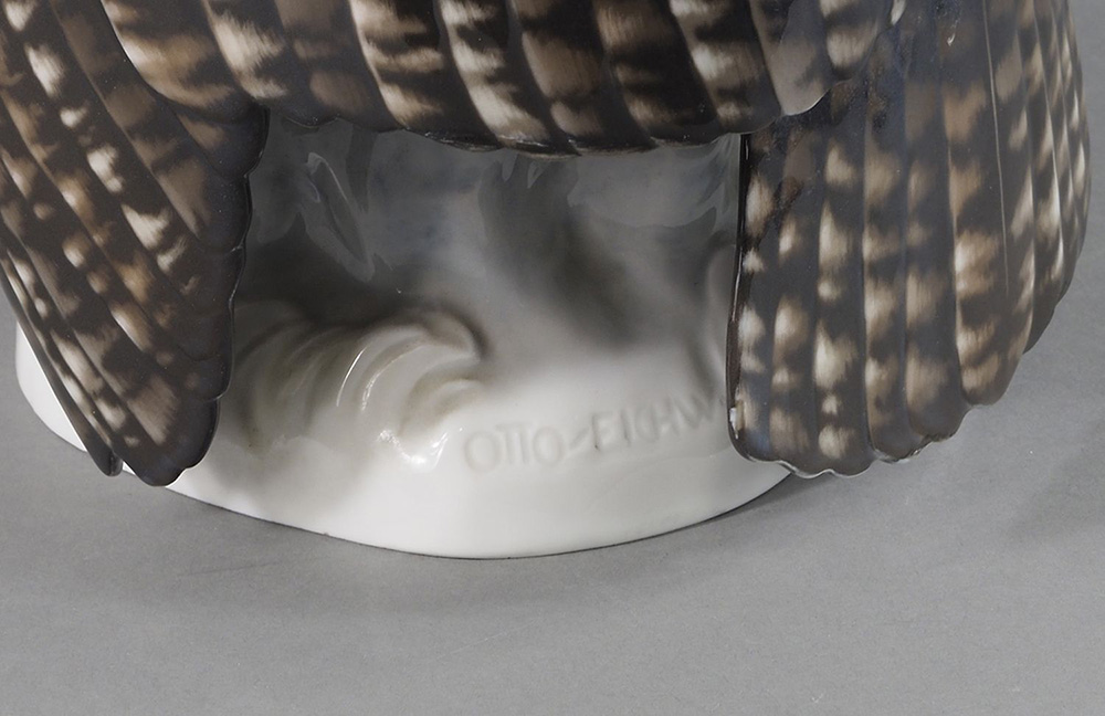 Rosenthal: figura di gufo in porcellana policroma. Marcata sotto la base. Firmata Otto Eichwald, H. cm. 24.