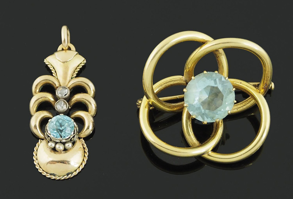 Lotto composto da spilla e ciondolo in oro giallo e topazio azzurro di forma...