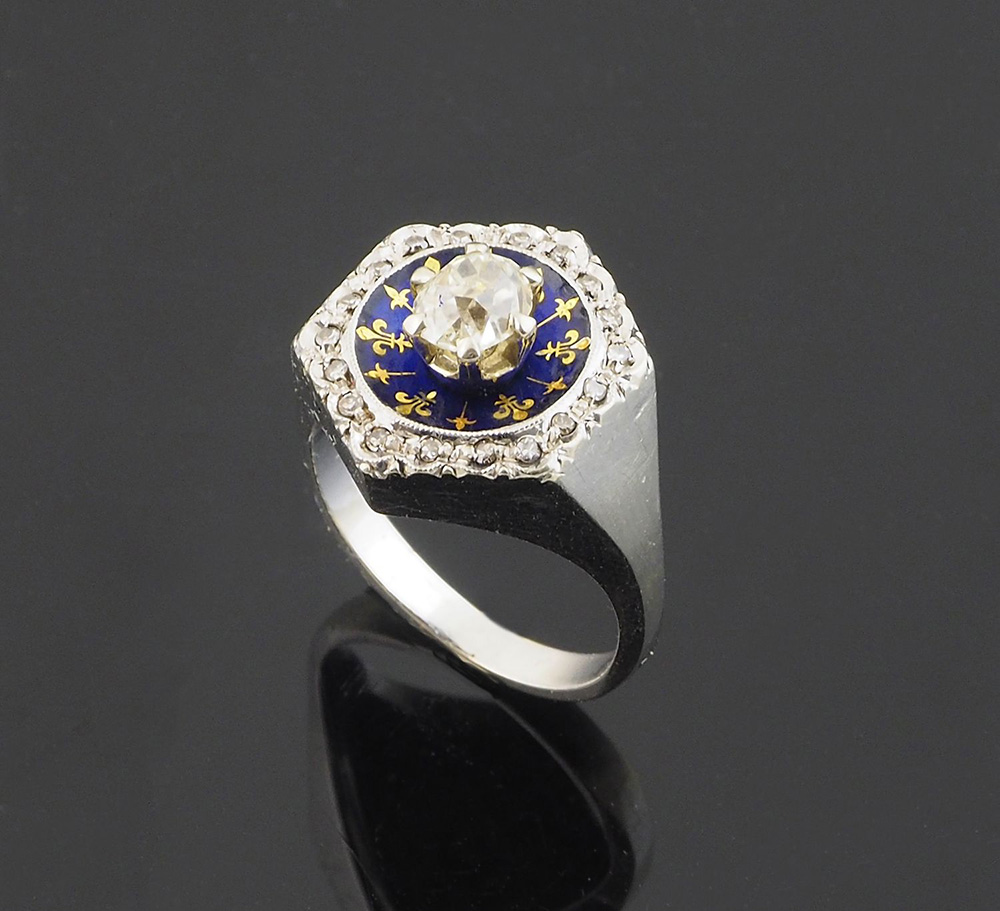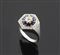Anello in oro bianco con diamante al centro contornato da smalti e piccoli diamanti taglio huit-huit per 0,75ct circa. gr. 7,34.