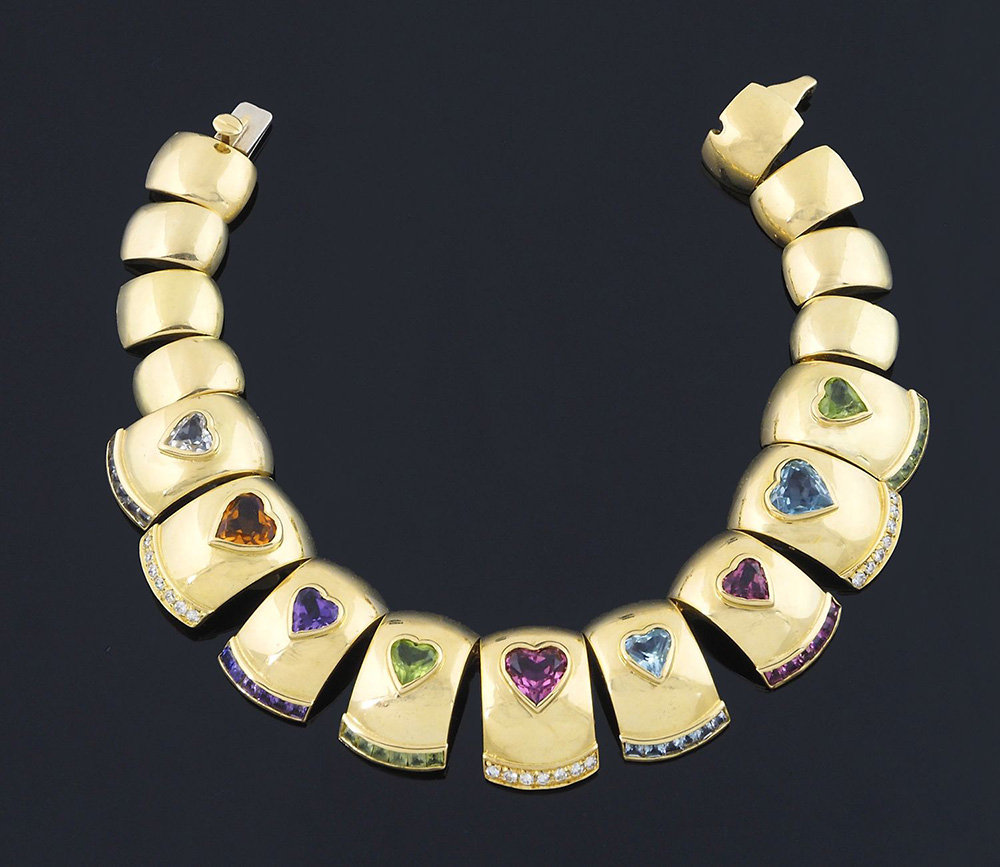 Bracciale in oro giallo con maglie bombate, ognuna ornata con cuoricini in tormalina, topazio azzurro, peridoto, quarzo citrino e ametista, sui bordi brillantini, Firmato Sabbadini