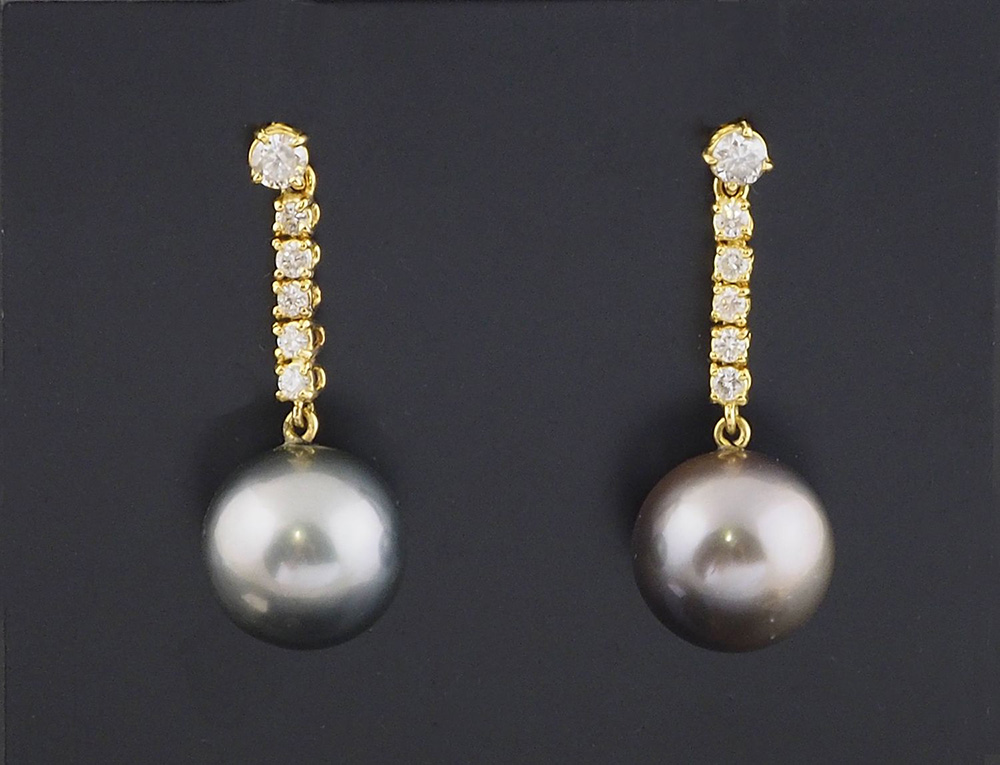 Orecchini in oro bianco pendenti con didiscesa di 5 diamanti taglio brillante per ca tot ct 1 conclusi da perla grigia Tahiti di mm13.