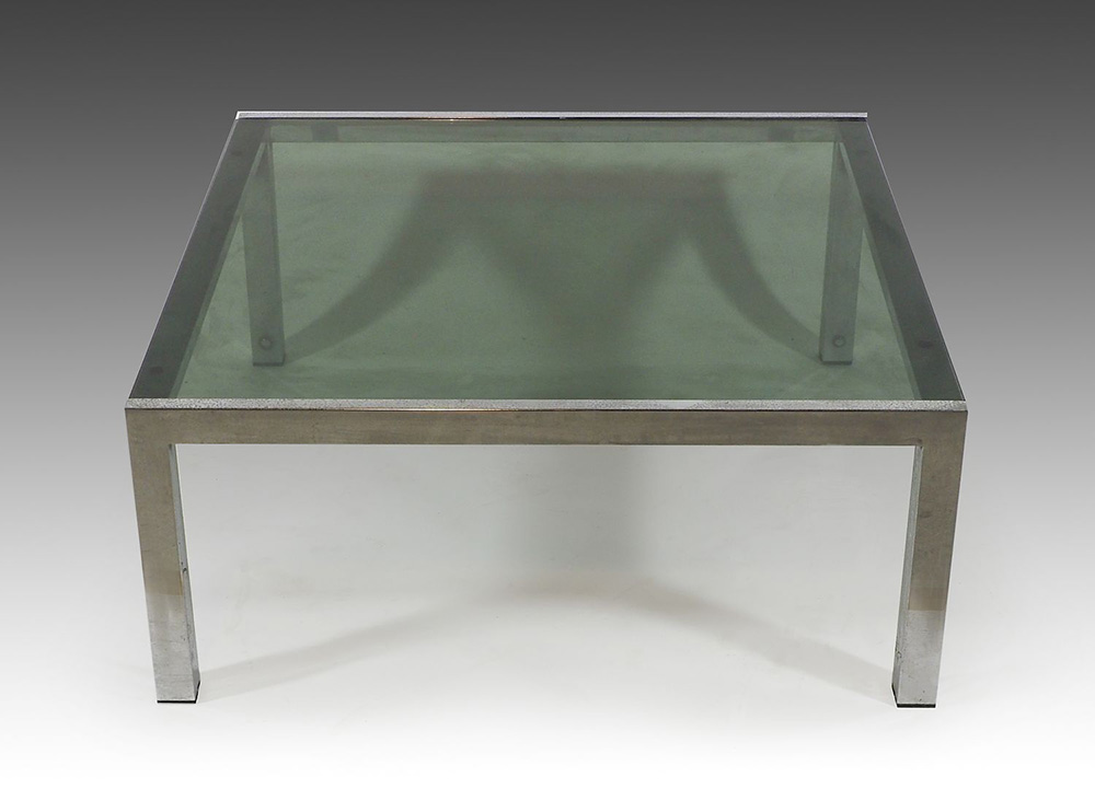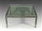 Tavolo basso quadrato in metallo cromato con vetro fumè. Anni '80. cm. 35x80x80.