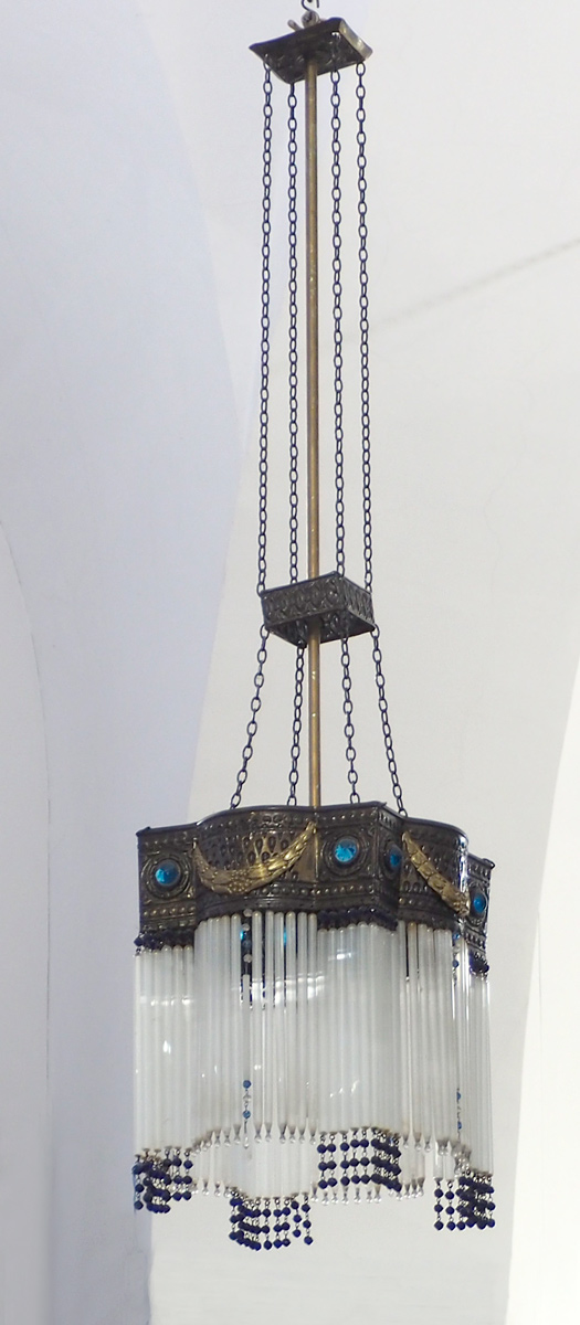 Lampadario a sezione quadrata con decori e canule in vetro. Art-Decò.