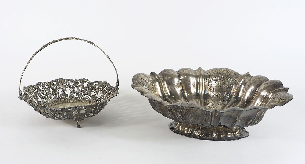 Lotto in argento composto da cestino traforato con manico e centrotavola ovale. Gr. tot 1050.