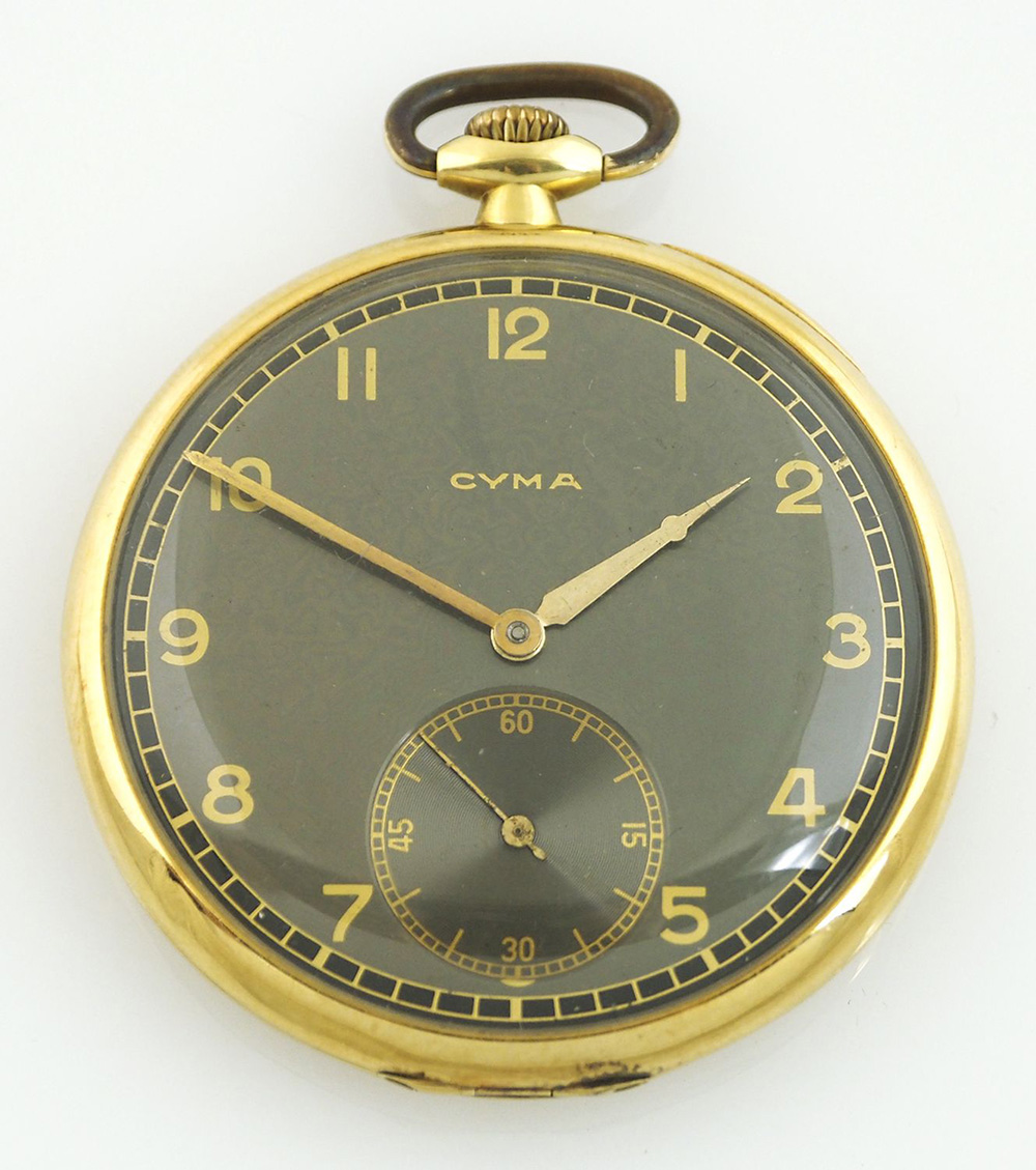 CYMA: orologio da tasca in metallo dorato inciso, quadrante scuro con secondi...