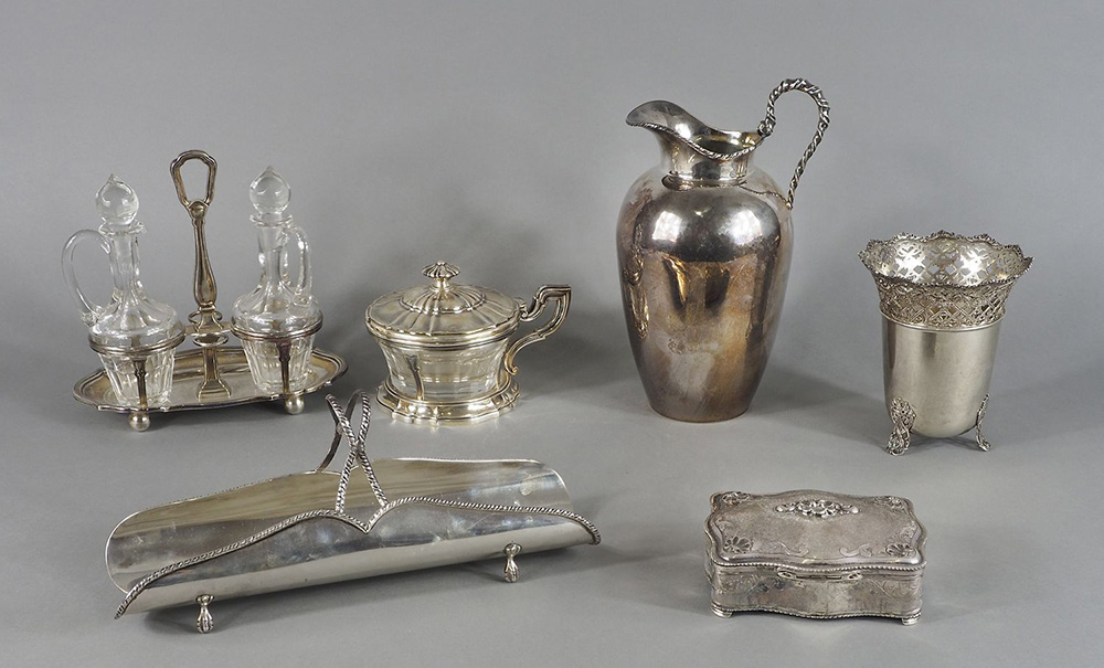 Lotto di vari oggetti in argento tra cui brocca, oliera e portagrissini. Gr. tot 1780.