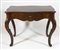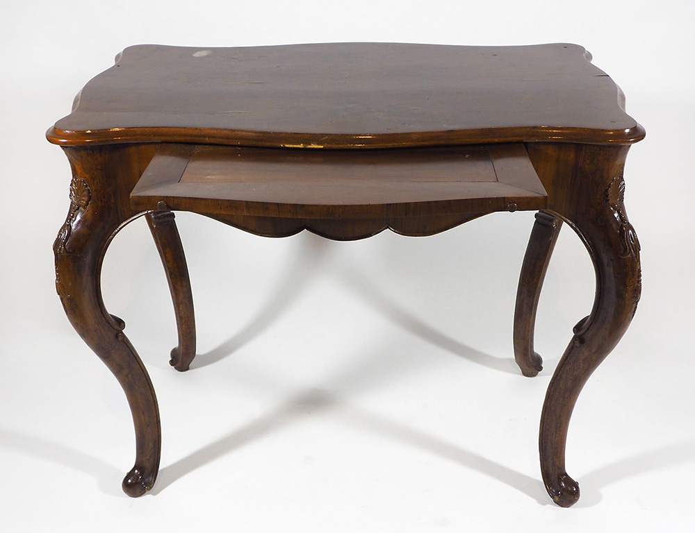 Scrivania in legno con cassetto centrale, su alte gambe mosse. cm. 78x98x59.