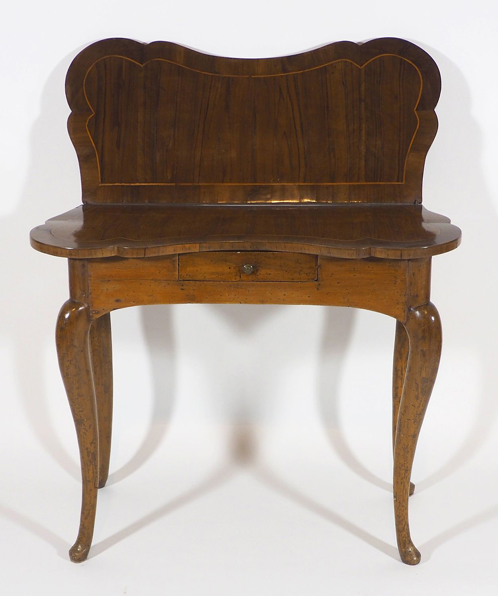 Tavolino da gioco con piano apribile e piccolo cassetto, intarsi a filettature.