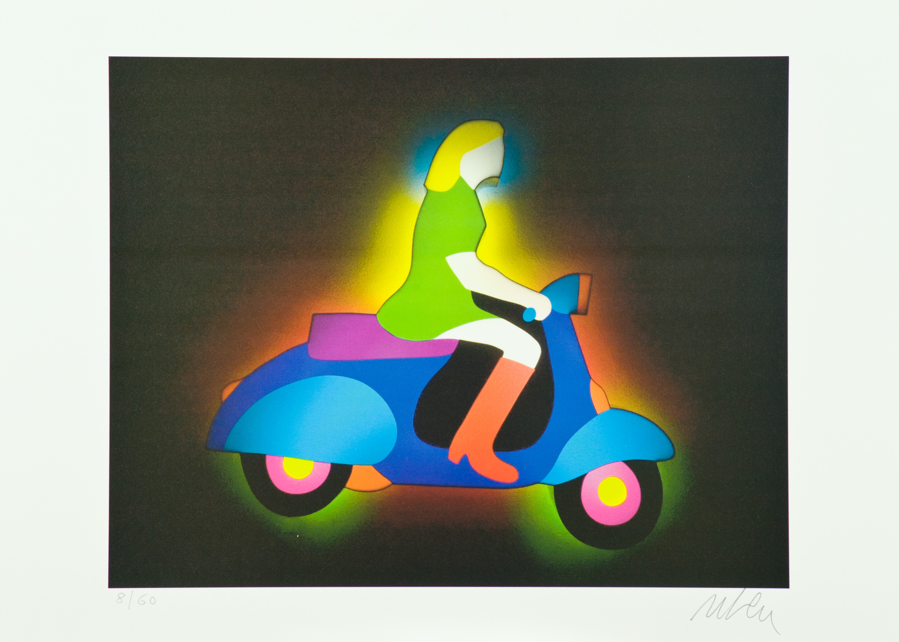Marco Lodola Lotto unico di due Opere - "Auto", Litografia su carta, cm. 34x48, es. 31/70, firma in basso a destra, tiratura in basso a sinistra; - "Vespa", Litografia su carta, cm. 34x48, es. 8/60, firma in basso a destra, tiratura in basso a sinistra.