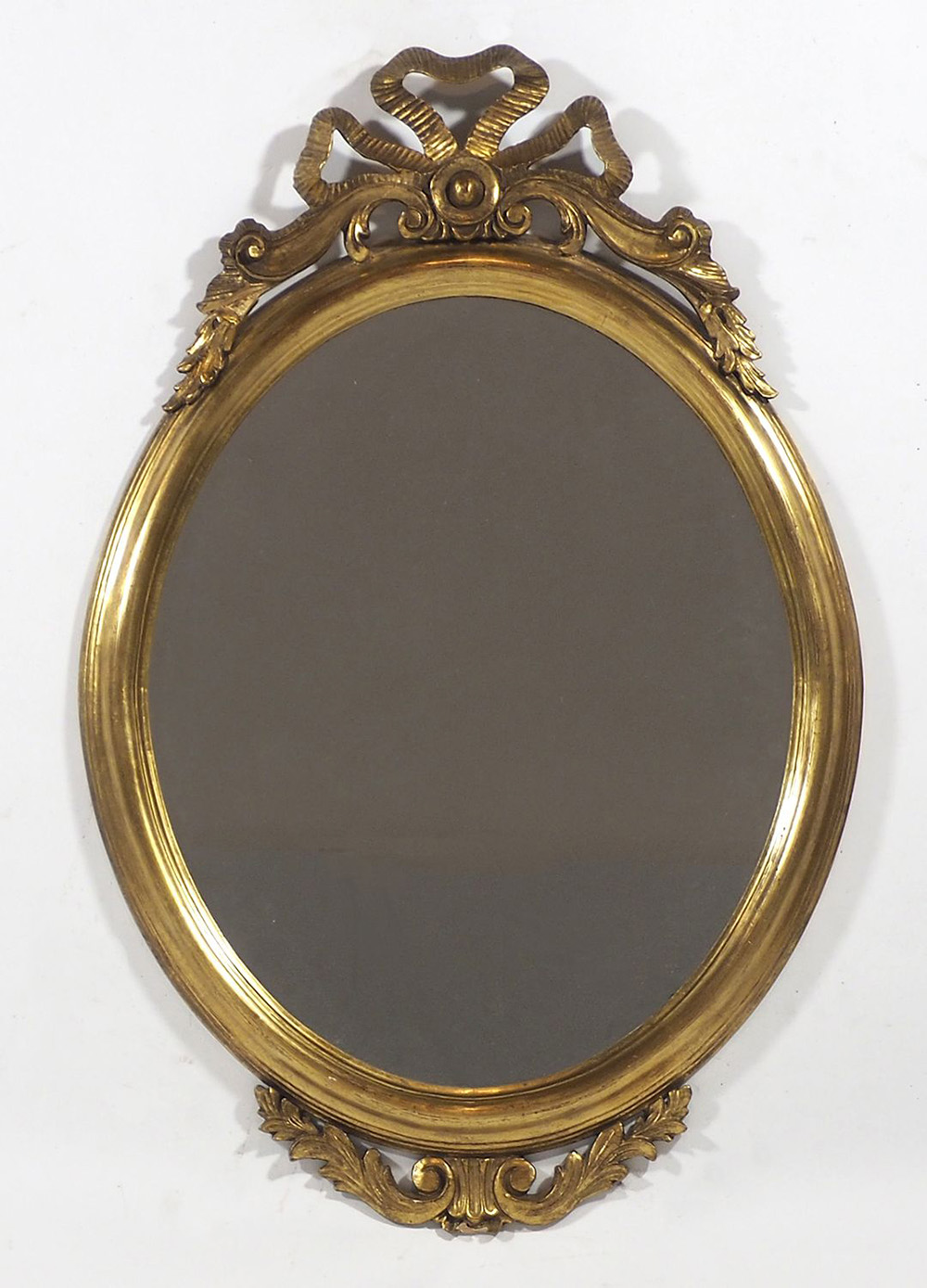 Specchio con cornice ovale in legno dorato e cimasa scolpita. cm. 94x63.