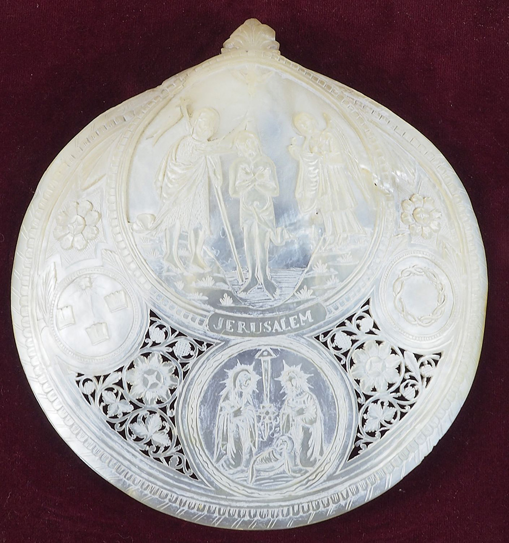 Conchiglia di madreperla finemente incisa e traforata con scena sacra. cm. 17x16.